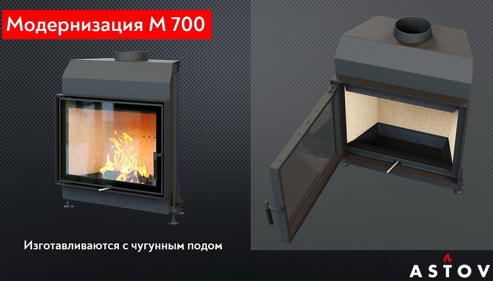 В каминной топке М 700 установлена футеровка вермикулит, обладающая высокой теплоотражающей способностью, что значительно увеличивает КПД и коэффициент сгорания. Он обладает низкой теплопроводностью, минерал способен усилить огнестойкость других печных материалов, имеет высокие показатели огнеупорности, является химически инертным и теплостойким веществом, обладает высокими изоляционными свойствами. Кроме того, футеровка вермикулитом имеет эстетически приятный, монолитный вид.